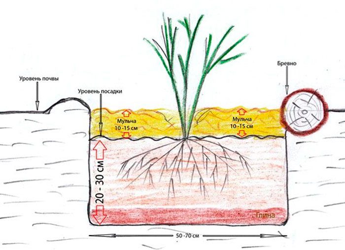 У посадкову яму треба всипати ½ відра компосту або перегною, 100 грам суперфосфату, 0,5 літрів деревної золи і невелику кількість ґрунту з неплодородного шару. Все гарненько змішайте. Даною землесумішшю слід наповнити яму на 1/3. Потім яму до половини заповнюють живильним грунтом, взятої з верхнього шару грунту. В кінці в неї слід залити 10 л води.