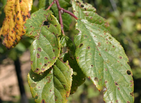 Якщо на листових пластинках з'являються цятки світло-жовтого, бурого або блідо-рудого забарвлення, то це означає, що рослина заражене бурою плямистістю. Такі плями можуть мати облямівку або ні, по мірі того як хвороба розвивається, на їх поверхні утворюються спори грибка, які являють собою точки чорного кольору. З часом тканина в цих місцях засихає і випадає, від чого на пластині з'являються дірочки. Заражені листові пластини відмирають. Щоб вилікувати вражений примірник, для початку з нього треба обірвати всю заражену листя, яку обов'язково знищують. Потім рослину і поверхня пристовбурового кола слід піддати обробці бордоською сумішшю (1%), при цьому вишню треба буде обприскати 3 рази: коли нирки почнуть розкриватися, коли рослина відцвіте і через 15-20 днів після другого обприскування.