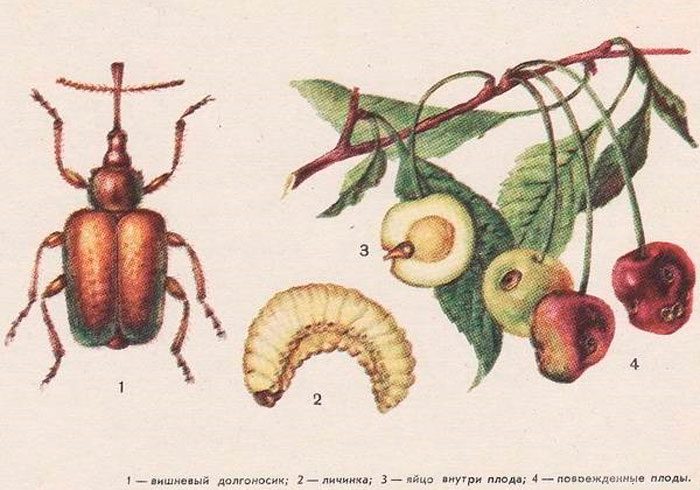 Вишневий довгоносик є невеликим жуком зелено-бронзового кольору з малиновим відливом, він виходить з лялечки з середини до кінця травня. Такий жук поїдає бутони, листя, бруньки і зав'язі рослини. Самка довгоносика виробляє відкладання яєць в оболонку кісточки, і одна особина може завдати шкоди близько 200 ягодам. З яєць з'являються личинки, які поїдають ядро кісточки. Ті плоди, які були ушкоджені личинками, опадають. Щоб позбутися такого шкідника, потрібно обприскати рослину після того, як воно відцвіте, повторну обробку проводять через 1,5 тижні. Для обробки використовують Ровикурт, Амбуш або Актеліком в дозуванні, яка вказана в інструкції.