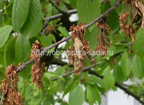 Якщо на поверхні листя з'являються маленькі червоні крапочки з нижньої сторони пластини, покриті нальотом рожевого кольору, то це означає, що вишня вражена коккомікозом. Уражене листя стає бурою і засихає. Найбільш часто це захворювання зустрічається у регіонах з вологим кліматом. Починати лікування рослини слід після того, як з квіток облетять пелюстки, його обробляють розчином Хоруса (на 1 відро води 2 г препарату). Повторно дану обробку проводять через 20 днів після закінчення цвітіння. Третє обприскування слід провести через 20 діб після збору врожаю.
