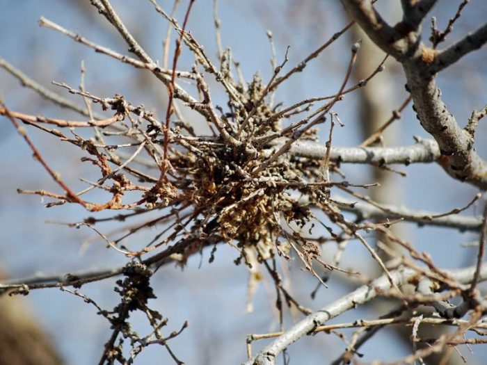 Такий грибок, як відьмина мітла паразитує на плодових деревах. Він сприяє утворенню великої кількості безплідних тоненьких пагонів. На уражених примірниках листя стає невиразною і набуває блідо-червоний відтінок. Листові пластини дрібнішають, стають крихкими і зморщеними. У кінці літнього періоду на виворітній поверхні листя можна виявити наліт сірого забарвлення, в якому знаходяться спори грибка. Зріжте всі уражені стебла з появою тоненькими пагонами. Сама рослина треба обприскати розчином залізного купоросу (5%).