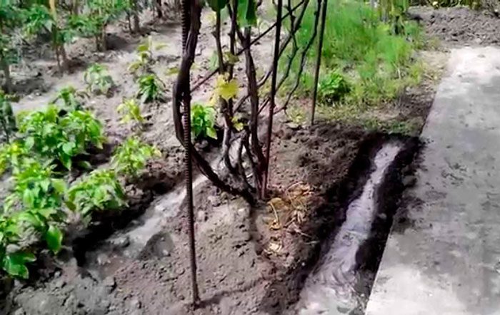 Коли у весняний час ви приступите до висадження винограду, то для початку на дні ямки прямо по центру слід насипати горбик з поживного грунту. Безпосередньо перед висаджуванням кореневу систему рослини занурюють у бовтанку, яку треба приготувати наступним чином: в 1 відро води потрібно всипати 1 маленьку ложку гумату і все добре перемішати, потім засипають таку кількість глини, щоб отримана маса по консистенції була схожа з магазинної сметаною. Потім виноград поміщають у яму, його встановлюють на горбочку кореневої п'ятою на південь, а нирками на північ. Корінці треба акуратно розправити і засипати їх шаром родючого ґрунту десятисантиметровой товщини. Наповнити яму доверху потрібно сумішшю, що складається з рівних частин піску та чорнозему. Утрамбуйте грунт навколо рослинки. Поверхня ями треба накрити чорної садової плівкою, при цьому для винограду і для труби потрібно обов'язково вирізати отвори. Саджанець слід накрити пластиковою пляшкою об'ємом 5 або 6 л зі зрізаним горлом. Поливати саджанець треба буде через вкопанную трубу (дренажний).