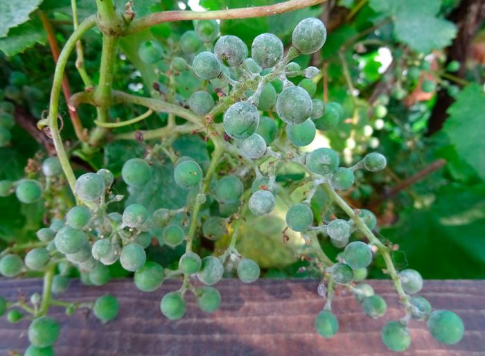 Таке грибкове захворювання є виноградної борошнистою росою. На поверхні ураженої куща з'являється біло-сірий борошнистий наліт. По мірі того, як захворювання буде розвиватися, суцвіття почнуть опадати, листові пластини стануть кучерявим, а плоди будуть лопатися або засихати. Найчастіше такою хворобою виноград захворює у вологу і теплу погоду. Висока ймовірність зараження у сильнооблиственных екземплярів, які володіють не дуже хорошою вентиляцією. В цілях профілактики не допускайте загущення куща, для цього потрібно виробляти підв'язку гілок, виламування зайвих стебел, своєчасне виривання бур'янів. Обприскати виноград можна Хорусом, Топазом, Таносом, Стробі або Тиовитом.