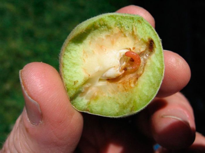 Східна плодожерка пошкоджує молоді пагони, прогризаючи в них ходи. Після того як вона добирається до здерев'янілого ділянки, то оселяється на новому втечу. Дізнатися про наявність плодожерки можна за засыхающим і ламається пагонам. Гусениці також не оминають своєю увагою і плоди, пошкоджуючи їх м'якоть. Обробку проводять двічі: після того, як дерево відцвіте, і коли будуть зібрані всі плоди. Для цього використовують сольовий розчин (на 1 відро води 0,5–0,7 кг солі). Щоб обприскати молоде рослина буде достатньо від 1,5 до 2 літрів готового розчину, а для дорослого ― приблизно 7 літрів.