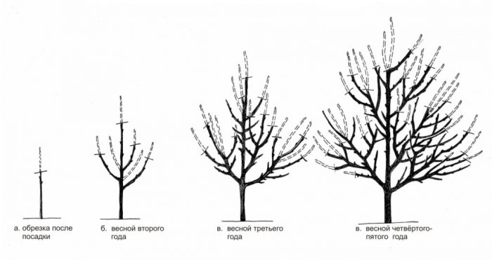 У перший рік у саджанця буде активно рости провідник. У перші осінні тижні провідник висадженого минулої осені рослини необхідно вкоротити на ¼ частину. На майбутній рік садівникові належить зайнятися формировкой скелетних гілок. Для цього треба буде вибрати 2 найбільш потужні гілки, які залишаться на дереві, їх обрізають на ½ частину, при цьому залишилися гілки слід вирізати на кільце. Центральний провідник потрібно вкоротити, і при цьому він повинен на 20-25 сантиметрів бути довшим скелетних гілок. З гілок потрібно обрізати пагони, які ростуть під гострим кутом.