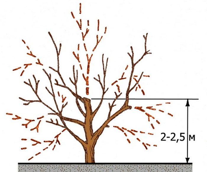 Потім на наступні роки треба буде закласти ще від 3 до 5 скелетних гілок, при цьому слід на них почати формування розгалуження другого порядку, яке повинно перебувати на відстані 0,3–0,4 м одна від одної. Не слід допускати того, щоб пагони, що знаходяться у верхній частині крони, обганяли в зростанні нижні. Непотрібні стебла потрібно вирізати. Коли буде закладена сьома і остання скелетна гілку, з настанням наступного весняного періоду потрібно буде обрізати провідник врівень з нею, так як він більше не потрібен. Після того як крона буде сформована повністю, вам залишиться лише підтримувати її форму, при цьому не допускайте її загущення. У сильноветвящихся сортів стебла слід укорочувати на 1/3, а в тих, що відрізняються поганим галуженням ― всього на ½ частину. Якщо дерево швидкоросле, то його слід піддати обрізанні 3 рази за сезон, при цьому сильні стебла треба вкоротити на ½ частину, а слабкі ― на¼.