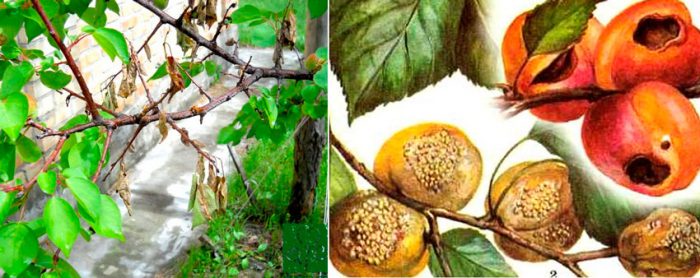 При зараженні дерева моніліозом спочатку починають в'янути квітки, потім відбувається ураження стебел і листя, а потім і гілок. По мірі розвитку захворювання на поверхні гілок з'являються тріщинки. Рослина починає засихати. У боротьбі з моніліозом потрібно обприскати абрикос поки бутончики ще зелені бордоською рідиною (3%). Під час цвітіння для обробки потрібно застосовувати засіб Тельдор. Коли дерево відцвіте, його потрібно буде обприскати засобом Хорус. Коли плоди почнуть зріти, знадобиться 2 обробки ураженої рослини з перервою в 1,5 тижні і використовують для цього розчин Світча (на 1 відро води 5 грам речовини). При цьому вдруге обробити рослину потрібно за півмісяця до збору плодів.