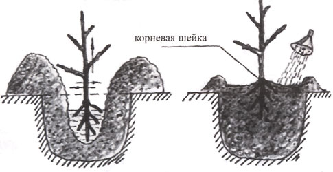 З настанням весняного періоду слід викопати яму в підготовленому котловані, при цьому її величина повинна бути дорівнює розміру системи коріння саджанця. Огляньте коріння рослини і виріжте всі травмовані, загнили або засохлі, а решту необхідно трохи вкоротити. Кореневу систему треба на деякий час занурити в глиняну бовтанку з додаванням коров'яку, потім її поміщають в посадкову ямку. Саджанець треба розмістити таким чином, щоб коренева шийка височіла над поверхнею ділянки на 50-60 мм. Яму слід закопати почвосмесью, яку треба добре ущільнити. Посаджену рослину потрібно добре полити, так, під один кущ виливають 20-30 літрів води. Після того як вода повністю вбереться в грунт, коренева шийка рослини повинна бути на рівні поверхні ділянки. Тільки після цього рослинка треба буде підв'язати до заздалегідь встановленим кілочка.