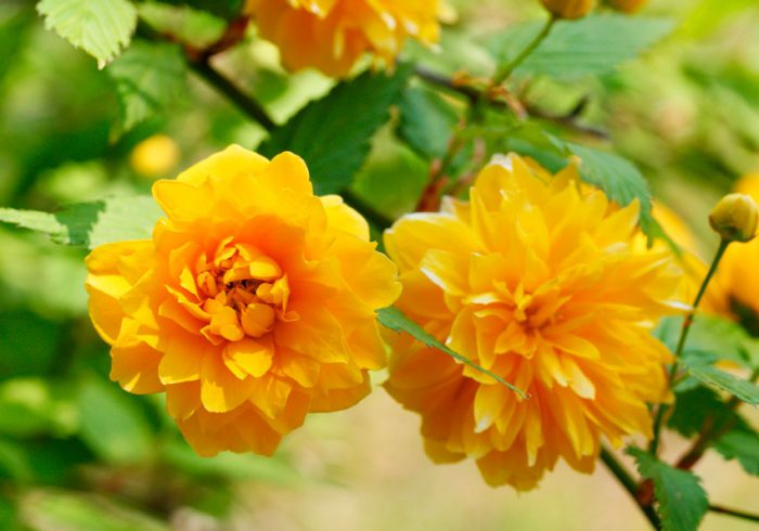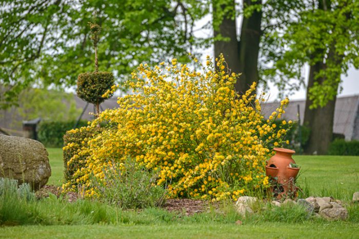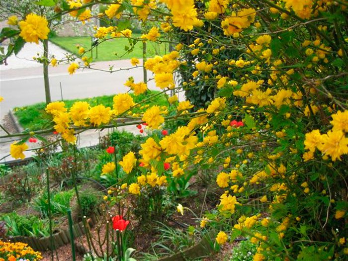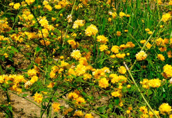 - Керрия пленифлора. У весняний час кущ обліплює величезна кількість маленьких махрових квіток зовні схожих з помпонами.