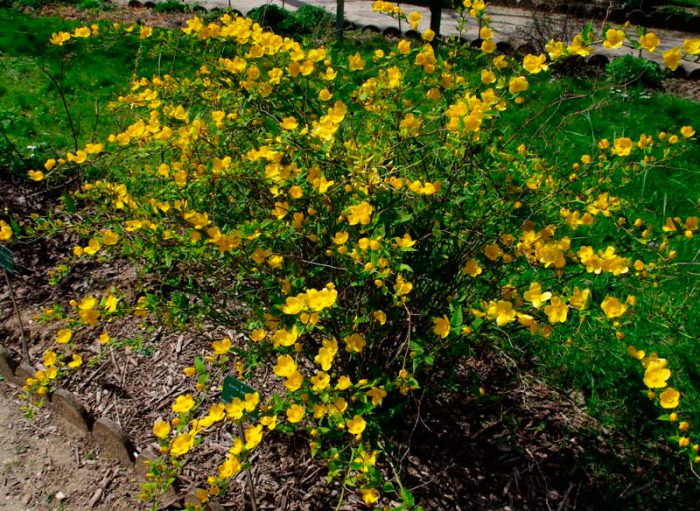 - Керрия голден гінея. Кущ прикрашають витончені листові пластини, а також прості квітки, діаметр яких дорівнює 60 мм.