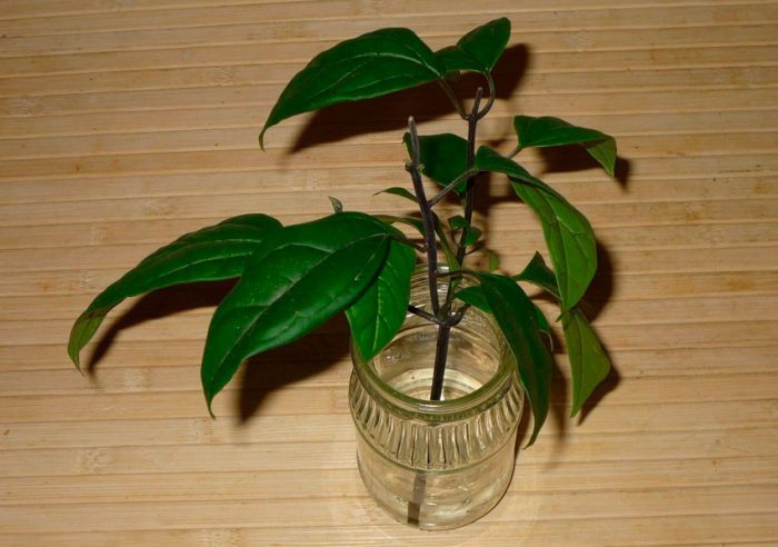 Заготівлю живців проводять на самому початку весни до набрякання бруньок. Пам'ятайте, що на кожному черешку повинно бути по 6 нирок. Живці потрібно занурити в ємність з водою, розміщеної у саду, при цьому в рідині повинна перебувати лише їх ½ частину. Приблизно через 8 тижнів з нирок, що знаходяться в нижній частині черешка, зростуть корінці. Після того як в довжину корінці будуть досягати 7 сантиметрів, держак потрібно висадити у відкритий ґрунт і зверху накрити пластиковою пляшкою, у якої попередньо зрізається горлечко. Через 1,5 тижні пляшки залишають лише на ніч, а на день їх знімають, це дозволить растеньицам поступово звикнути до нових умов.