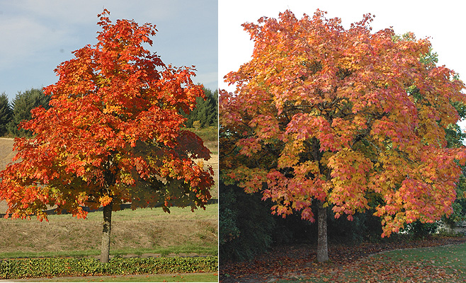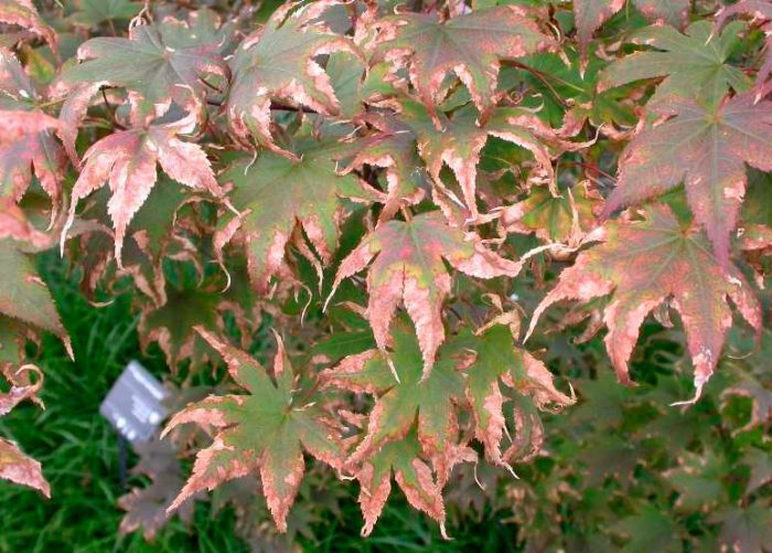 Така рослина відрізняється своєю стрункістю. У висоту вона може сягати близько 20 метрів, при цьому діаметр крони дорівнює приблизно 8 метрів. Гілки спрямовані вгору. До складу пальчасто-розділених листових пластин входить п'ять частин, пофарбовані вони в насичено-червоний колір.