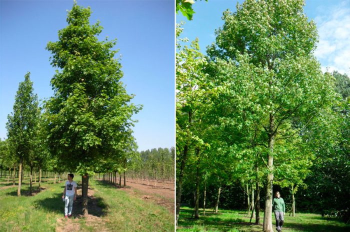 Листя при розпусканні пофарбована в червоний колір, поступово змінявся темно-зеленим. В осінній час вона набуває насичено-жовтого забарвлення. Висота рослини варіюється від 12 до 15 метрів, крона має яйцевидної форми.