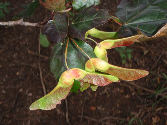 У висоту дерево не перевищує 7 метрів, при цьому діаметр крони може бути 3-5 метрів. Пальчасто-роздільні листові пластини складаються з п'яти частин. Коли листя тільки розпускається, вона має рожевим забарвленням, потім відбувається зміна її кольору на темно-зелений. В осінній час листочки стають оранжево-жовтими.