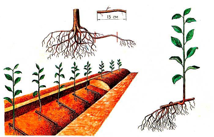 На отросшей кореневої порослі треба буде зробити гострим ножем кілька надрізів, при цьому вони повинні знаходитись як можна ближче до поверхні ділянки. Потім проводять обробку ран засобом, що стимулює ріст коренів, а потім відводок треба високо підгорнути (рани повинні прикриті грунтом). Протягом вегетаційного періоду забезпечте отводку систематичний полив і підгортання. Після того як настане наступна весна, відводок буде готовий до відокремлення та пересаджування на постійне місце, так як у нього розвинеться власна система коренів.