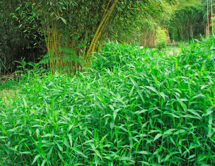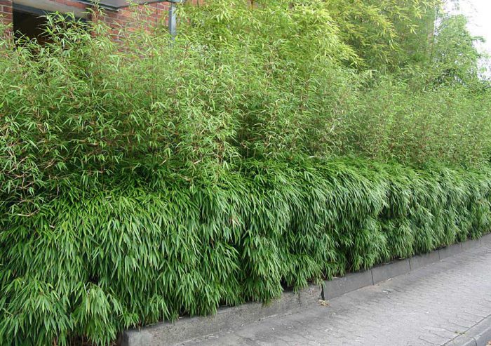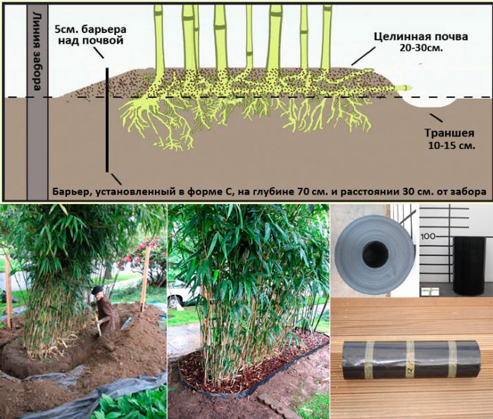 Садівниками культивується 2 основні різновиди бамбука, а саме: кущистий і біжить. Особливість кущистого бамбуку в тому, що він росте щільними групами і при цьому не розповзається по ділянці. А ось у біжить бамбука коренева система розростається поверхнево, не заглубляясь в грунт більш ніж на 5-20 сантиметрів, а іноді вони розташовуються безпосередньо на її поверхні. Таке рослина здатна швидко розростатися, захоплюючи все нові ділянки, якщо це не входить у ваші плани, то потрібно буде своєчасно обрубувати відростаючих коріння, причому не один раз за сезон. Ті корені, що ви відрубали, слід витягнути з грунту і утилізувати, так як вони здатні продовжити свій розвиток далі. Можна обмежити розростання біжить бамбука раз і назавжди, для цього по периметру ділянки треба вкопати шматки шиферу, їх треба заглиблювати на 100-150 сантиметрів, а над поверхнею грунту вони повинні виступати на 5-10 сантиметрів. Також обмежити ріст коренів бамбука можна бар'єрної плівкою (корінь-бар'єр), яка являє собою жорстку і гнучку пластикову стрічку, яка має ширину 0,5–1 м і товщину — 0,6 див. Цю стрічку треба вкопати в грунт по периметру ділянки під нахилом. При цьому нижній закопаний край повинен бути спрямований у бік ділянки, а верхній — навпаки від нього. Листи шиферу, плівки або заліза повинні бути з'єднані внахлест, а не встик, в іншому випадку потужні коріння бамбука прорвуться крізь них.