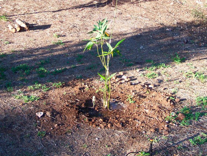 Висаджувати бамбук у відкритий грунт слід точно так само, як і інші рослини в саду. Для початку потрібно підготувати посадкову яму, слід врахувати, що її величина повинна в 2 рази перевищувати об'єм системи коріння саджанця. Потім її дно засипають шаром живильного садової землі, яку заздалегідь перемішують з перегноєм, його потрібно ущільнити. Саджанець слід занурити в ємність, заповнену водою, разом з контейнером, в якому він росте, на кілька годин. Виймати рослина з контейнера слід тільки після того, як повністю припинять виходити на поверхню бульбашки повітря. Потім його акуратно опускають у підготовлену яму, яку засипають почвосмесью, що складається з живильного садової грунту і перегною, яку треба добре ущільнювати, намагаючись усунути всі порожнечі. Верхній шар грунту (приблизно 2-5 сантиметрів) ущільнювати не треба. Висаджену рослину необхідно дуже добре полити, при цьому повинні повністю зникнути всі залишилися порожнечі.