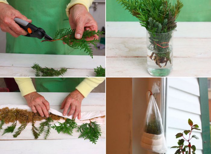 Заготівлю живців проводять у весняний час. Нарізку верхівкових живців проводять з молоденьких бічних стебел. Довжина живців може варіюватися від 5 до 15 сантиметрів. Нижню частину живців треба звільнити від хвої, а потім їх садять для вкорінення в горщики, наповнені почвосмесью, до складу якої увійшли перліт і пісок (1:1), в цю суміш також рекомендується всипати трохи маленькій хвойної кори. Після цього ємність потрібно накрити пакетом з поліетилену. Якщо постійно підтримувати вологість повітря близьку до 100 відсотків, то тоді живці дадуть корінці вже через 4-8 тижнів. Живці при бажанні можна посадити відразу у відкритий ґрунт, при цьому їх треба накрити пластиковими пляшками, у яких заздалегідь слід зрізати горлечка. Живці, висаджені у відкритий грунт, можуть пережити зиму без укриття, але тільки в тому випадку, якщо вони розвиваються нормально. Якщо укорінення живців відбувається вкрай повільно, то зимувати вони повинні будуть в приміщенні.