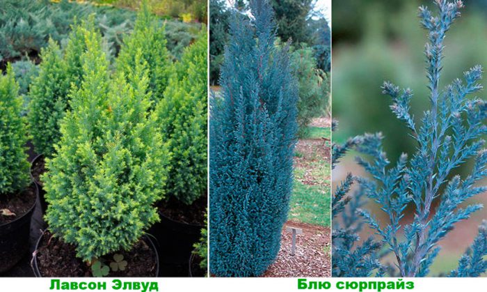 - Лавсон Флэтчери. У висоту може досягати 8 м. У цього дерева крона колоновидна при цьому гілки спрямовані вгору. У зелених або світло-блакитних гілок з настанням осені з'являється пурпурний відтінок. Культивується з 1911р.