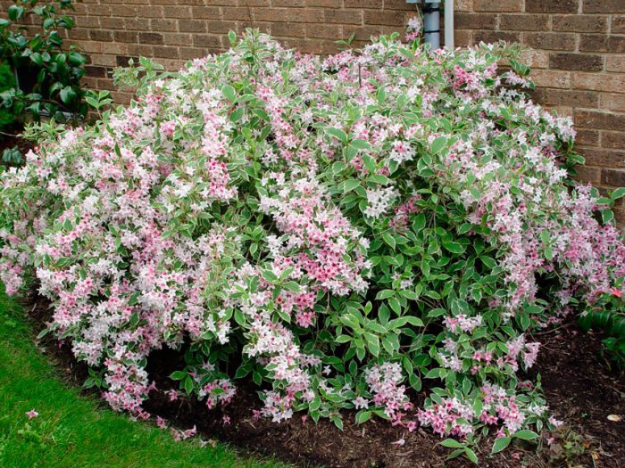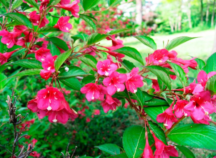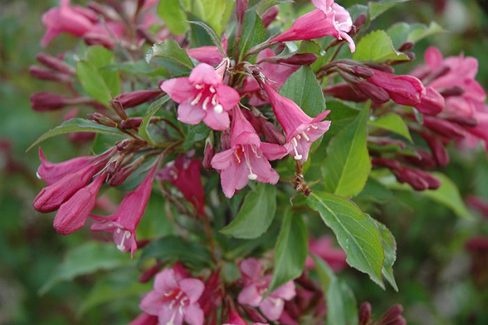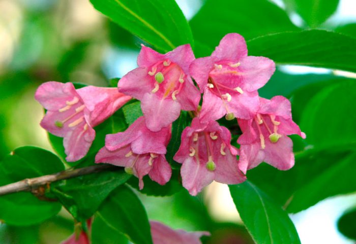 - Вейгела рожева (Weigela florida Bunge). Зовнішня поверхня квіток кармінно-рожева, а внутрішня — практично біла.