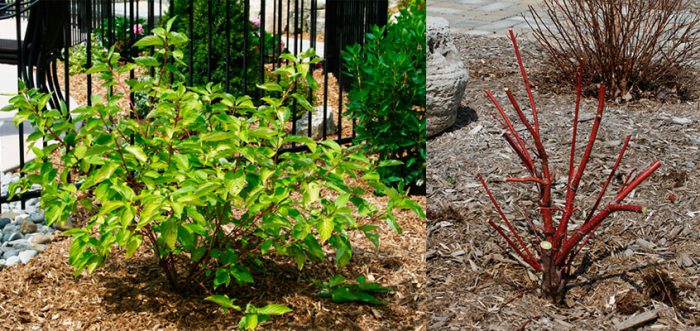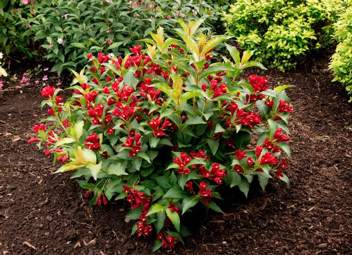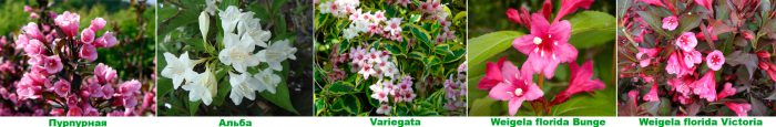 - Вейгела Вікторія (Weigela florida Victoria). Висота куща близько 100 сантиметрів. Листя коричнево-червона, а квітки мають багряний забарвлення.