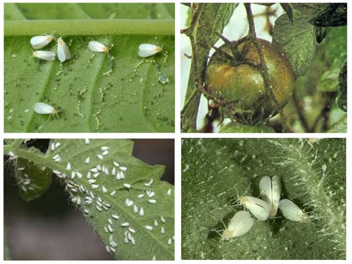 Буває, що на тепличних томатах поселяється білокрилка. Це метелик півтора сантиметрової довжини. Її тіло має світло-жовте забарвлення, а крильця ― білувато-борошнистий. Личинки такого шкідника плоскі, мають овальну форму і світло-зелене забарвлення. Вони присмоктуються до листових пластин і висмоктують з них сік. У тих місцях, де є такі личинки, утворюється наліт чорного забарвлення від сажистого гриба, і через якийсь час листові пластини засихають і відмирають. Для боротьби з білокрилками застосовують розчин кошти Фосбецид (на відро води 10 мл препарату). Обробляють кущики рано вранці або після того, як сяде сонце. Потрібно 2 обробки з інтервалом 14-20 днів. Якщо цвітіння ще не почалося, то для обробки можна використовувати рідкий дим Сочва.