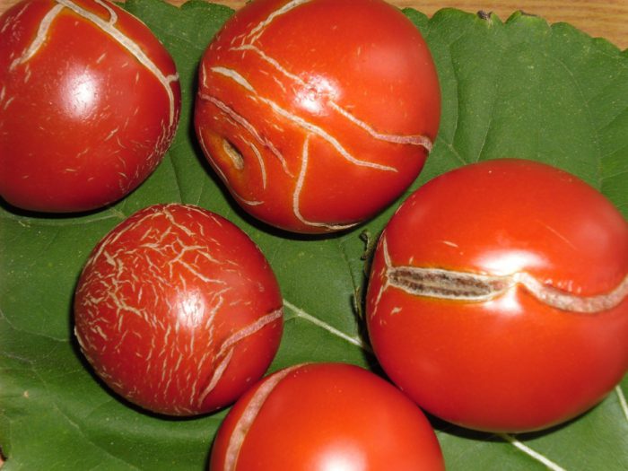 Якщо стоїть тривалий час спекотна погода, то на плодах тепличних помідорів можуть з'явитися тріщини. Це явище не пов'язане ні з якими хворобами, а викликано цілком фізіологічними причинами. Плоди починають лопатися з-за того, що в тривалу посуху різко збільшується інтенсивність поливів. В плоди надходить досить багато води, і не витримали стінки епідермісу розриваються. Через якийсь час утворилися тріщини підсихають, плід при цьому починає швидко заспівати і припиняє рости. Щоб не допустити розтріскування помідорів, полив слід проводити частіше, але при цьому використовувати не дуже велика кількість води. А для того щоб зберегти грунт як можна довше вологим, його поверхню треба закрити покривним матеріалом. Якщо теплиця зроблена зі скла, то в спеку її поверхню зовні треба обробити вапняним молоком.