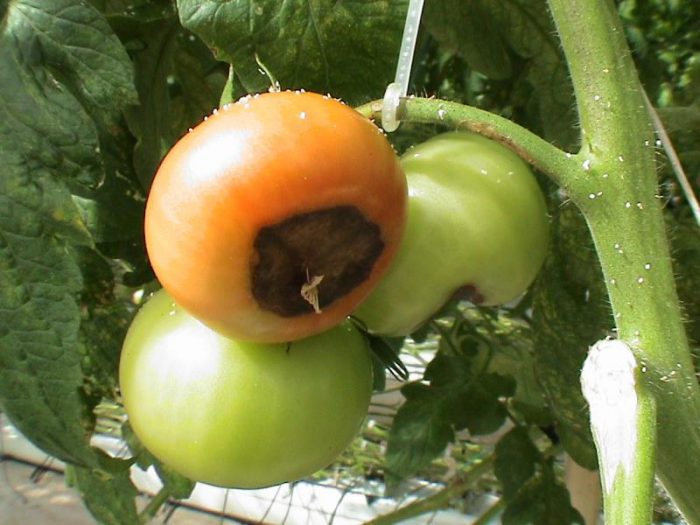 Гнити плоди томатів можуть через вершинної або сірої гнилі. На зеленому зараженому плоді знизу з'являється водянисте цятка, згодом воно стає сухим, при цьому його колір стає коричнево-сірим. Потім на поверхні плями з'являється щільна кірочка, яка здатна розтріскуватися. Така гниль в короткі терміни вражає більше половини плоду, сприяючи розвитку цвілі. У деяких випадках відбувається не гниття, а висихання плодів. А іноді, про те що рослина боляче, можна дізнатися тільки після того, як плоди, внутрішня частина яких згнила, опаде на поверхню грунту. У тому випадку, якщо своєчасно не виявити хворобу і не вжити відповідних заходів, можна залишитися взагалі без врожаю. Таке захворювання розвивається через брак кальцію і порушеного водного балансу. Це проявляється в тому, що при високій температурі повітря в клітинах плодів міститься недостатня кількість вологи. Якщо є така проблема, то слід обрати правильний режим поливу, а також обприскати помідори розчином кальцієвої селітри (на піввідра води від 40 до 50 грам речовини). А ще слід підгодувати такі рослини, для цього в грунт вносять розчин мінерального добрива, до складу якого входить фосфор і калій. Також під корінь можна вилити розчин деревної золи, до складу якого входить залізо, калій, сірка, кальцій, фосфор, а також цинк (на відро води 250 грамів золи).