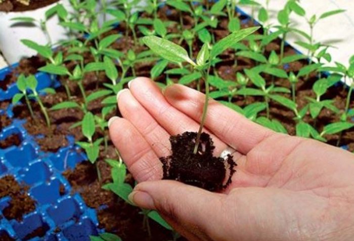 На поверхні субстрату потрібно зробити неглибокі (10-15 мм) борозенки, при цьому відстань між ними повинна бути від 5 до 7 сантиметрів. Їх треба добре полити теплою водою і тільки після цього розкласти насіння. Відстань між насінням має бути 15-20 мм. Потім насіння загортають, ємність зверху накривають склом або плівкою і ставлять її в добре освітлене місце. Під ящичок слід помістити підставку, так як повітря повинен вільно надходити до системи коренів знизу. Оптимальна температура для сіянців в цей час від 22 до 24 градусів.