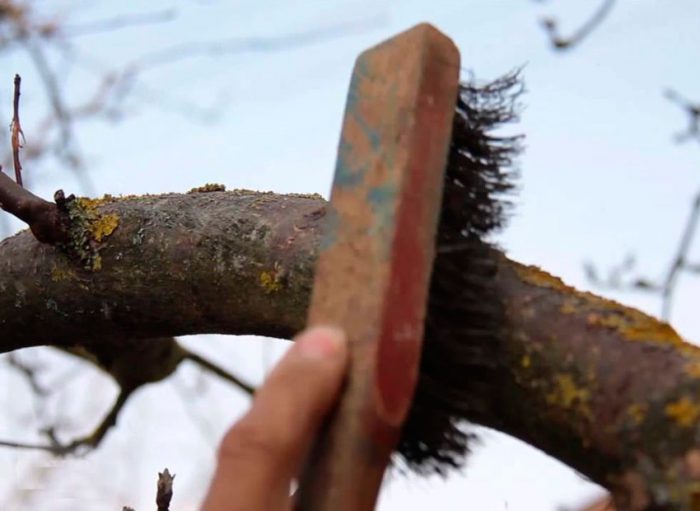 Слід особливо уважно поставитися до побілки старих дерев. Побілка на них лягає порівняно погано, тому що на старій корі є безліч нерівностей, тріщин. У зв'язку з цим, перш ніж білити дерево, треба провести очищення його стовбура, для цього вам знадобляться щітки, а також скребла. Однак найчастіше дану процедуру рекомендується проводити за допомогою простих ганчіркових рукавичок, так як вони не здатні сильно пошкодити стовбур дерева на відміну від щіток і скребків. Якщо ж ви вирішили провести очищення скребком, то слід пам'ятати, що робити це необхідно дотримуючись особливої обережності, тому що можна легко травмувати деревину.