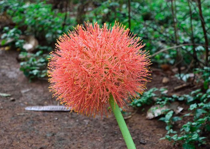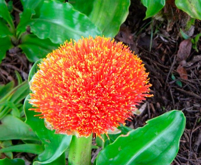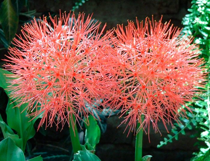 Або скадоксус багатоквітковий (Scadoxus multiflorus). Листові пластини у цього виду жилкуваті. На довгих квітконосах формуються великі суцвіття шарлахово-червоного або блідо-рожевого відтінку.
