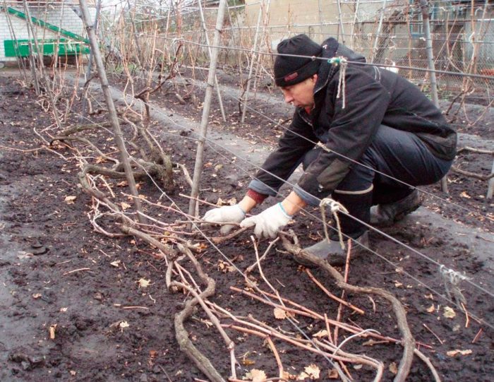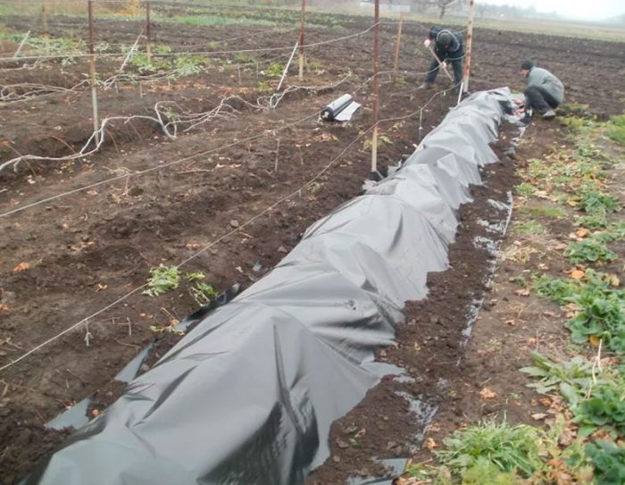 - роблять дуже тонкий шар мульчі, на який потім укладають зняту зі шпалер лозу;