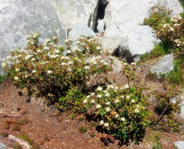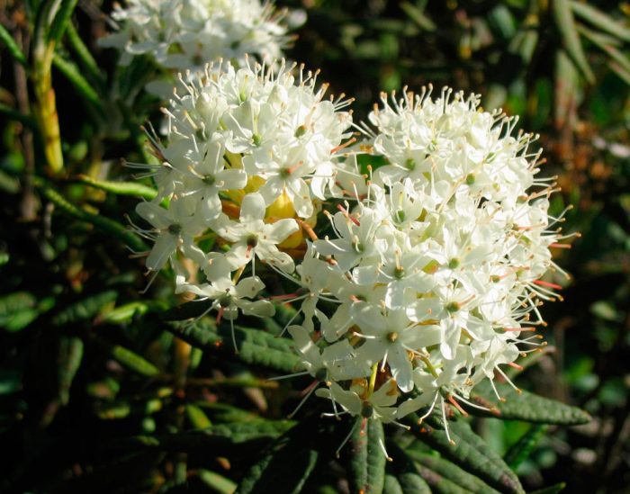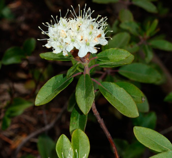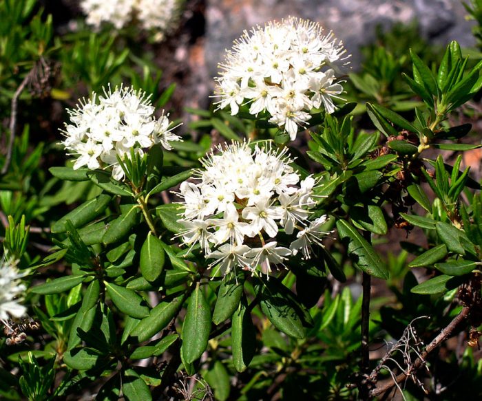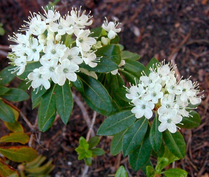 Пагони вилягають і досить жорсткі, в довжину вони можуть досягати близько 0,9 м. вони Пофарбовані в коричневий відтінок. Форма вузеньких листових пластин лінійна, вони розташовуються на стеблах дуже близько один до одного. При першому погляді може здатися, що гілки покриті м'якими хвоїнками насичено-зеленого забарвлення. На виворітній поверхні скручених листових пластин є опушення, представлене повстяним ворсом. Квітучий кущ прикрашають невеликі (близько 60 мм) зонтиковидні суцвіття з квітками кремового або білого відтінку. Цей вид відрізняється високою стійкістю до морозів.