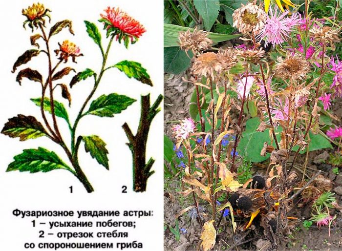 Айстри уражаються фузаріозним в'яненням під час формування бутонів або в самому початку розкриття квіток. На хворих кущах спостерігається скручування листя, поніканіе бутонів, а також поява на пагонах коричневих цяток довгастої форми, при цьому в області кореневої шийки утворюються бурі смуги. На хворих стеблах відбувається розрив тканин, а на поверхні прикореневих ділянок утворюється наліт грибниці або невеликі подушечки блідо-рожевого кольору, зростання айстр зупиняється, і вони швидко в'януть. Збудники захворювання потрапляють у рослини через коріння і дуже швидко просуваються по системі судин, яка вже не може функціонувати нормально.