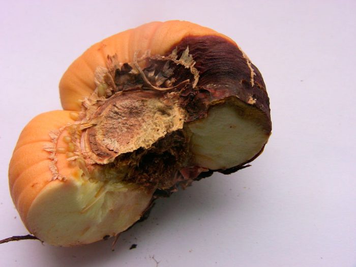- дінці стає м'яким і водянистим, після чого на ньому утворюється міцелій жовтого, білого або рожевого відтінку;