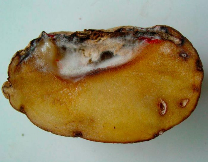 На бульбах у сховищі починає розвиватися суха фузаріозна гниль, вона починає псувати картопля зі столонной частини. На їх поверхні утворюються трохи вдавлені плями буро-сірого відтінку, при цьому м'якоть під ними висихає, стає трухлявої, потім в ній з часом з'являються порожнечі, заповнені грибницею. На поверхні картоплі утворюються подушечки блідо-рожевого, світло-жовтого або білястого відтінку. У уражених фузаріозом при проростанні бульб з'являються ниткоподібні паростки. Сусідні бульби уражуються інфекцією за короткий час.