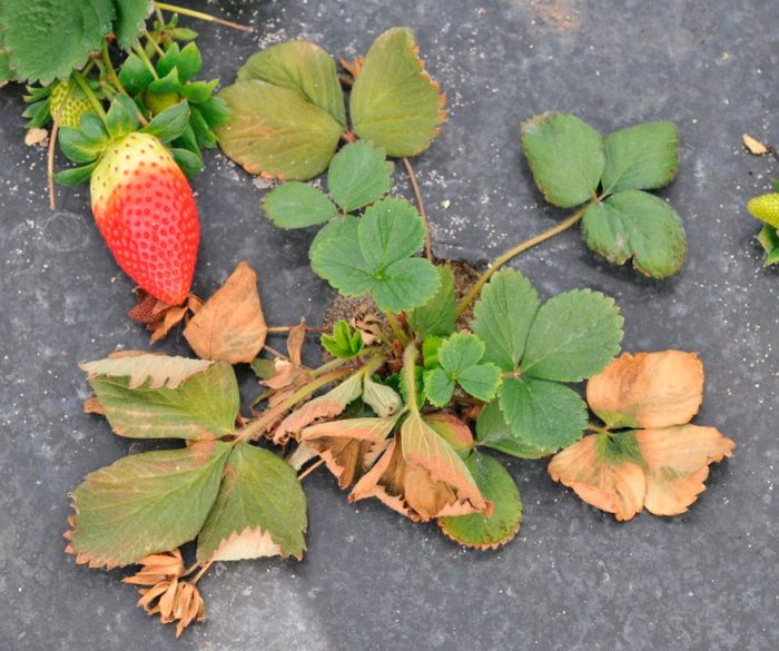 Першими симптомами ураження полуниці фузаріозним в'яненням вважаються: поява некрозів на кромці листових пластин і невелика втрата ними тургору. З часом відбувається побуріння листя і черешків, вони забарвлюються в коричневий, майже чорний, відтінок, і далі спостерігається їх відмирання. Відбувається розпад розетки, і кущі немов притискаються до поверхні грунту. Тривалість всього цього процесу ― приблизно 6 тижнів. Як правило, найбільш виразно ознаки хвороби стають помітні в самому початку періоду наливу і дозрівання плодів, саме в цей час кущі особливо сильно потребують вологи і поживних речовинах. Ступінь ураження такої рослини фузаріозом може залежати від віку посадки, кліматичних умов та рівня агротехніки. Потрібно пам'ятати про те, що більшість сортів полуниці схильні до поразки фузаріозним в'яненням. Однак зустрічаються сорти стійкі до цього захворювання, наприклад, Зенга.