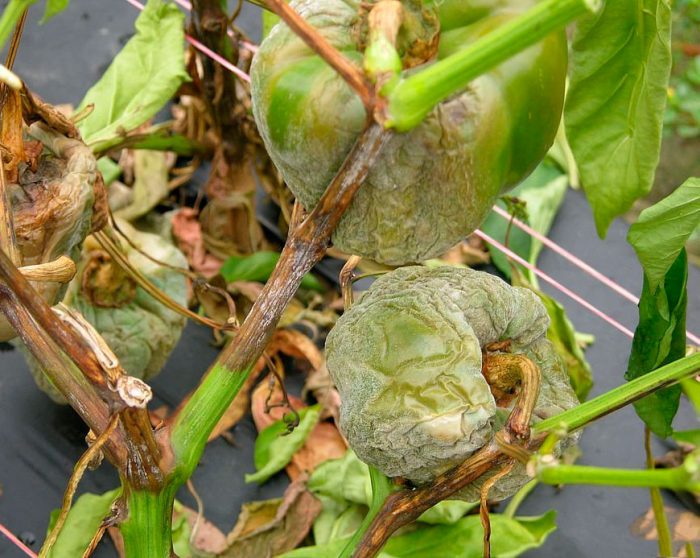 Плями фітофторозу можуть утворитися і на плодах, причому вони збільшуються як углиб, так і в ширину. Хворіють фітофторою і зрілі, і зелені плоди. А якщо ви зірвали з хворих кущів абсолютно здорові перець і томати, то вони все одно з часом почорніють.