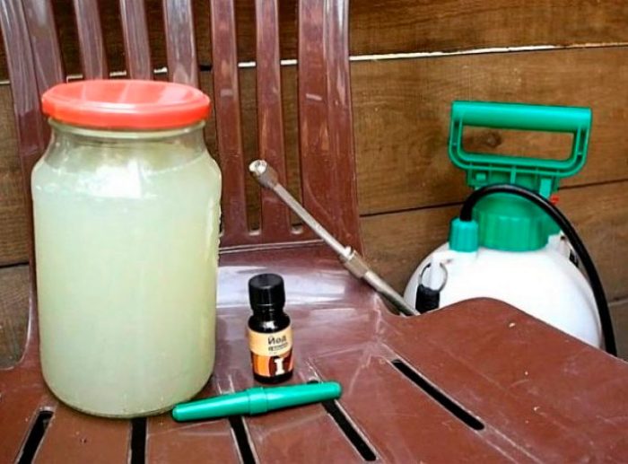 Відро води з'єднують з 1 л кефіру (бродившего 2 дня) або кисляку, обробіть сумішшю кущі. Перше обприскування таким складом можна провести через 15 днів після пересадки сіянців на грядку.
