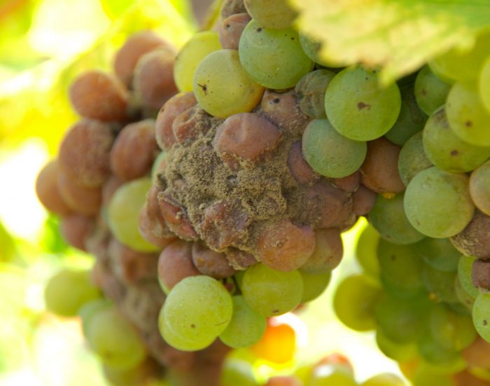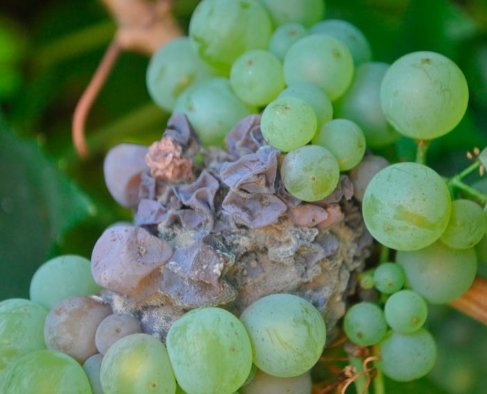 Ураження сірою гниллю схильні всі надземні частини винограду, але найбільшу небезпеку представляє ботритис на плодах. Найбільш активно розвивається і розповсюджується захворювання при підвищеній вологості і температурі повітря. При створенні таких сприятливих умов спочатку розвиток хвороби починається на пошкоджених плодах, а потім гниль поширюється на всю кисть. У суперечку ботритісу період інкубації становить від 25 до 35 ч. Якщо доторкнутися до сірого нальоту, то він розлетиться пилом, при цьому спори грибка потраплять на розташовані неподалік плоди і грона.