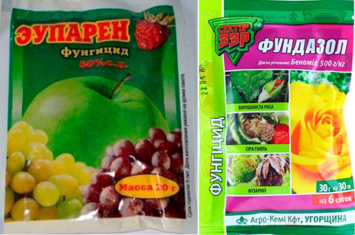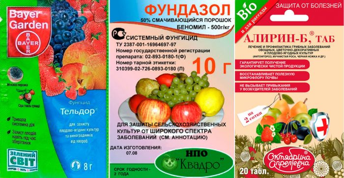 - Фундазол. Системне засіб широкого спектра дії, ним протягом сезону рослини обприскують не більше 2 разів, в іншому випадку у культур розвивається резистентність. Засіб небезпечно для тварин і людей.