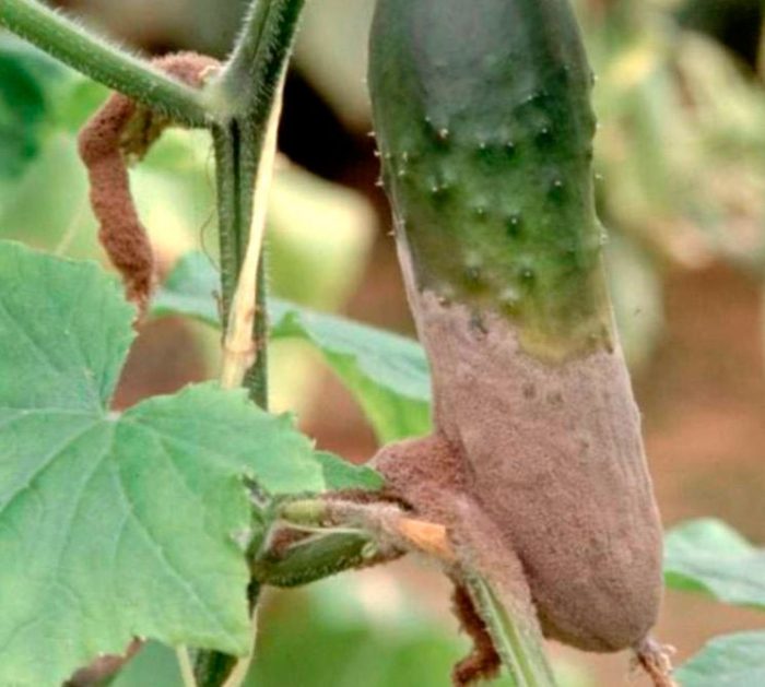 Ботритис також може вразити і огірки, при цьому збудник проникає через ранки. У деяких випадках збудник захворювання проникає в квітку через маточка, що призводить до появи гнилі на зародку. На хворих листових пластин виникають великі безформні плями, на поверхні яких є пухкий наліт сірого кольору. Розвиток хвороби може відбуватися і в міжвузлях, з-за чого відмирають ті частини куща, які розташовуються вище місця інфікування.