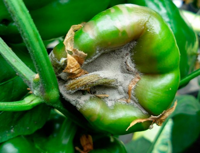Перець, зростаючий в закритому ґрунті, також може вразити сіра гниль. У цьому випадку на поверхні плодів, пагонів або квіток утворюються маленькі цятки темного кольору, які з часом зростають, стають мокнучими, а на їх поверхні утворюється наліт сірого відтінку. Для порятунку рослин необхідно:
