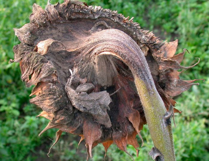 Всі надземні частини соняшнику можуть бути уражені сірою гниллю. У уражених хворобою молодих кущів підстава стебла стає жовтим, потім буріє, і на поверхні з'являється наліт сірого кольору, причому стебло, який розташовується вище, стає бляклим і гасне. На виворітній поверхні кошика з'являються гнильні цятки коричнево-сірого кольору, у яких може бути брудно-червона облямівка. Ці плями збільшуються в розмірах, і на їх поверхні утворюється попелястий наліт. Насіння, що знаходяться в хворий кошику, стають не всхожими, але навіть якщо вони і з'являться паростки, то вони будуть пофарбовані в темно-коричневий колір, і на них відразу ж присутній гниль. Це захворювання може погубити до половини врожаю соняшнику. У боротьбі з ним відразу після виявлення перших ознак сірої гнилі кущі обприскують розчином фунгіциду Пиктор. При культивуванні соняшнику необхідно дотримуватися таких превентивних заходів, як: