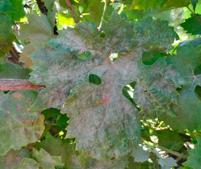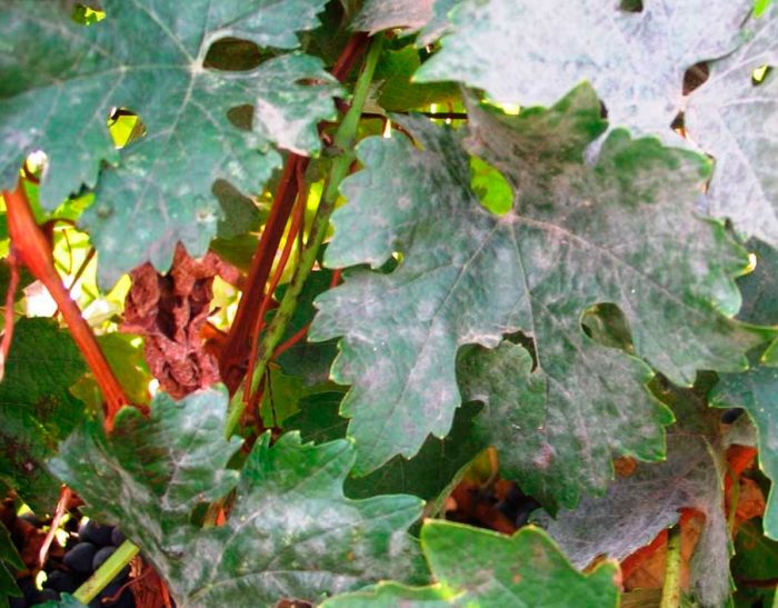 Як вже згадувалося вище, оїдіум для винограду є борошнистою росою, при цьому мілдью для даної культури ― це несправжня борошниста роса або пероноспороз. Дані захворювання сильно розрізняються між собою, а вони викликаються різними збудниками. Об'єднує їх те, що обидві ці грибкові хвороби, а також те, що вони можуть погубити майже весь урожай винограду. Ознаки даних хвороб так само сильно різняться між собою. Детальний опис симптомів оїдіума можна відшукати вище. Якщо ж виноград хворий мілдью, то на лицьовій поверхні його листя утворюються блідо-жовті маслянисті плями, після випадання роси чи туману на виворітній поверхні хворих листя з'являється наліт, через деякий час він стає бурим і висихає. Найбільш часто уражається мілдью молода листя винограду, а ще суцвіття, які стають бурими, стебла (на них з'являються чорніючі цятки) і незрілі плоди (вони стають темними в районі плодоніжки і облітають). Якщо ж виноградини не облетять, то вони все одно будуть мати кислуватий смак. Якщо на кущі до моменту ураження мілдью вже є повністю доспілі плоди, то вони не постраждають.