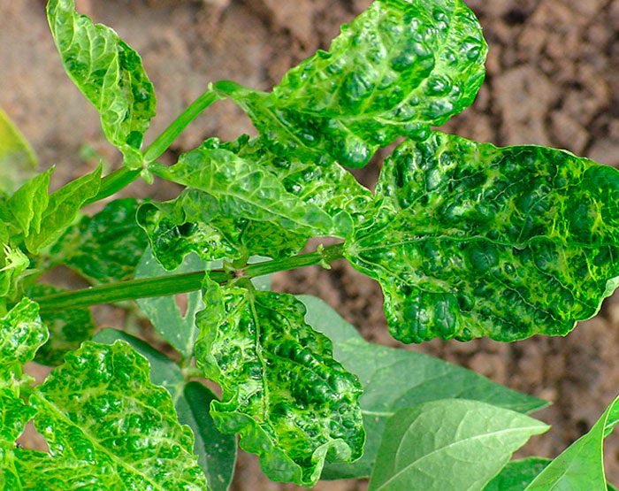 - на поверхні листових пластин утворюється мозаїчний візерунок, при цьому відбувається їх деформація, а жилки стають темними;