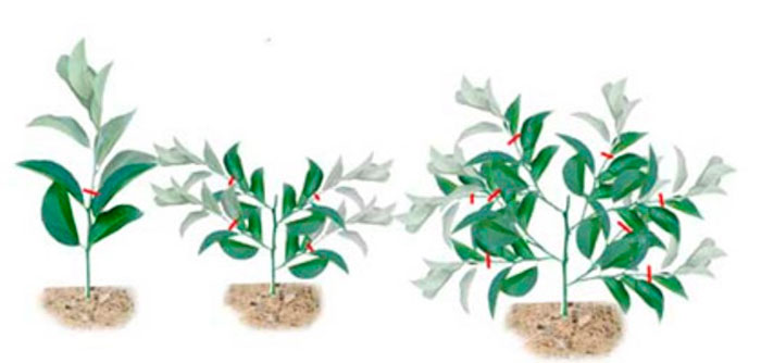 Щоб надати кроні правильну форму, слід вдатися до способу прищіпки. Коли перший нульовий пагін досягне в довжину від 20 до 25 сантиметрів, його треба буде прищипнути. Через деякий час втеча прищипують, відступивши від старої прищіпки від 15 до 20 сантиметрів. При цьому зверніть увагу на те, що між двома прищипками на пагоні має бути чотири добре розвинені бруньки. Через деякий час з них з'явиться 3 або 4 головних стебла, які повинні рости в різні сторони.