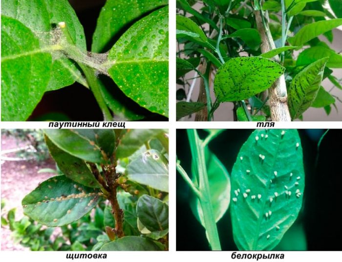 Крім павутинного кліща на лимонному дереві можуть оселитися попелиці, щитівки, білокрилки або борошнисті червці. Для того щоб позбутися від таких шкідливих комах нерідко застосовується часниковий настій. Для його приготування з'єднують 1 л чистої води і від 150 до 170 г дрібно порізаних часникових зубчиків. Ємність щільно закривають, і суміш залишають на 5 діб. Потім настій проціджують і розбавляють водою: на 1 л води 6 мг кошти. Їм потрібно обприскати дерево. Однак допомогти такий настій зможе лише тоді, коли шкідників на рослині небагато. При великому скупченні шкідників, для їх знищення використовують розчин інсектицидного препарату.
