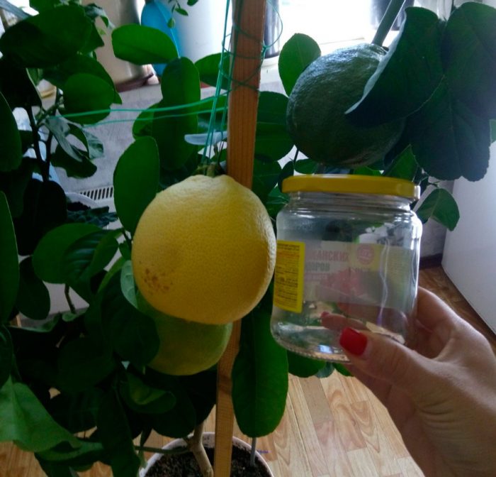 З органіки лимонне дерево найкраще відгукується на підгодівлю зольної витяжкою, а ще настоєм свіжого гною, який розводять водою в пропорції 1:5 або 1:6. Також підійде настій листя берези або лободи. Для його приготування скляну банку на ½ частину наповнюють дрібно нарізаним листям, потім вливають стільки води, щоб ємність була повною. Засіб буде готове через двоє або троє діб. Вносити органічні добрива у ґрунт потрібно з такою ж частотою, що і мінеральний комплекс.
