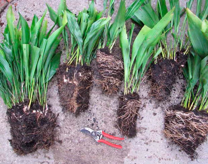 Спосіб розмноження аспідістри діленням куща відрізняється своєю простотою і ефективністю. Проводять цю процедуру навесні. Вийміть з горщика кущ і розділіть його систему коренів на кілька частин. Простежте за тим, щоб у кожній діленці було кореневище і не менше 5 листових пластин. Висадіть їх в окремі горщики в підходящий для такого рослини субстрат. Зверху їх накривають прозорим ковпаком і прибирають у прохолодне (не вище 18 градусів) і темне місце. У такому місці деленко будуть знаходитися до тих пір, поки у кожної з них не почне рости молоденька листова пластина, яка є ознакою того, що частина куща вкоренилася успішно. Для того щоб уникнути появи гнилі на деленках, їх перед висадкою обробляють деревною золою.